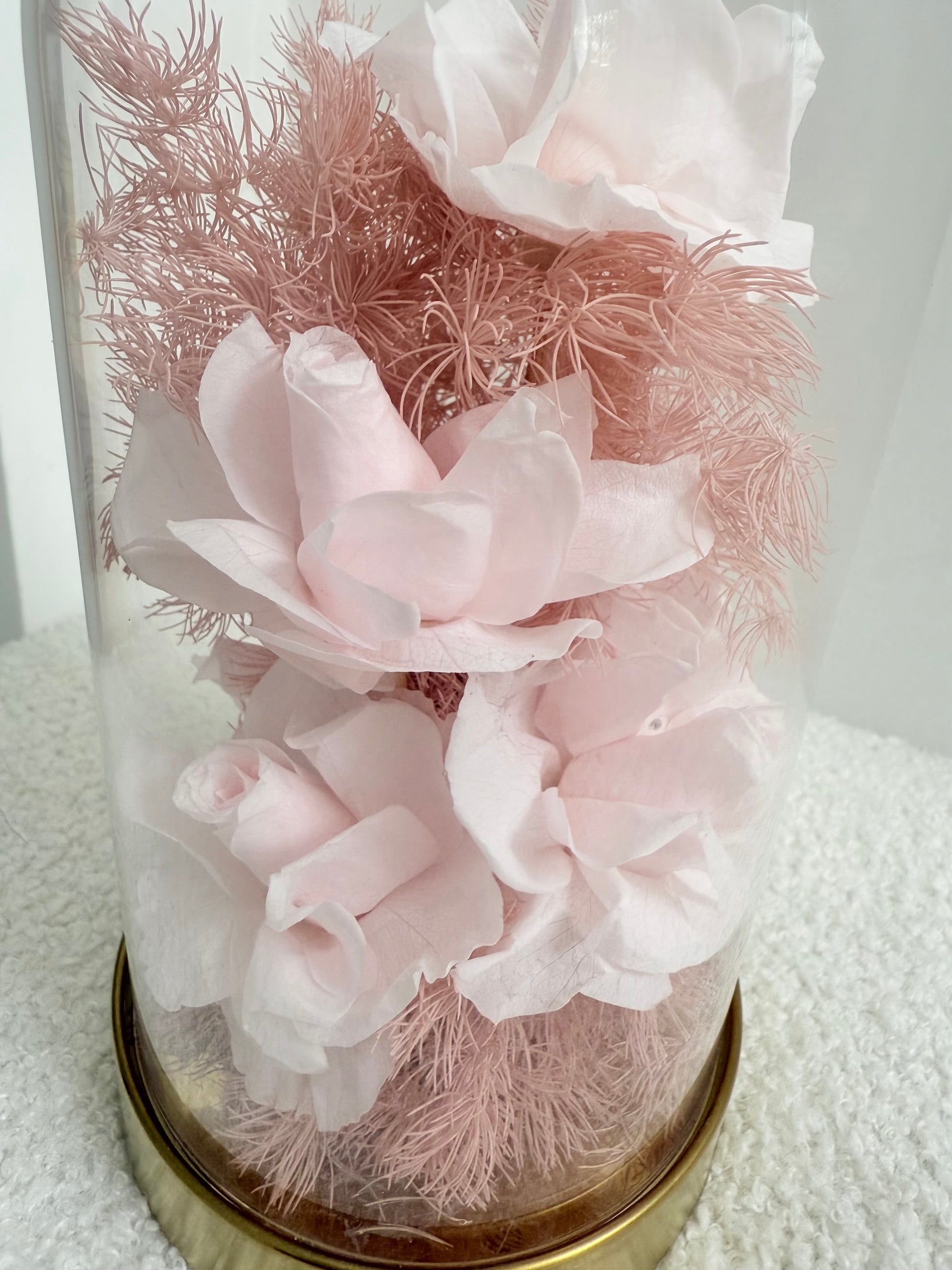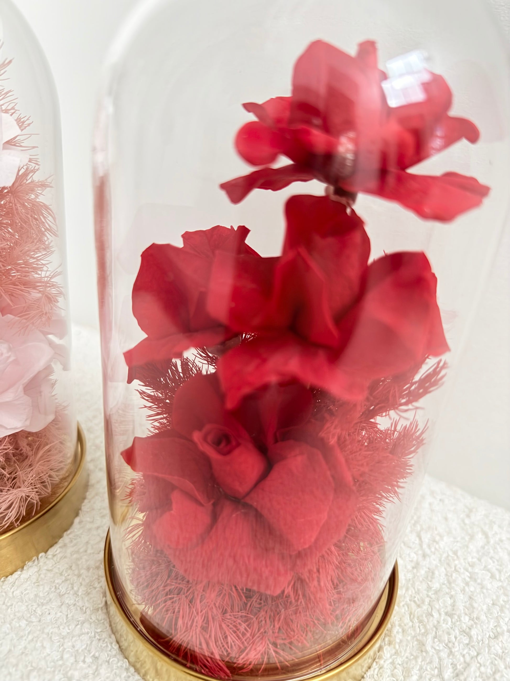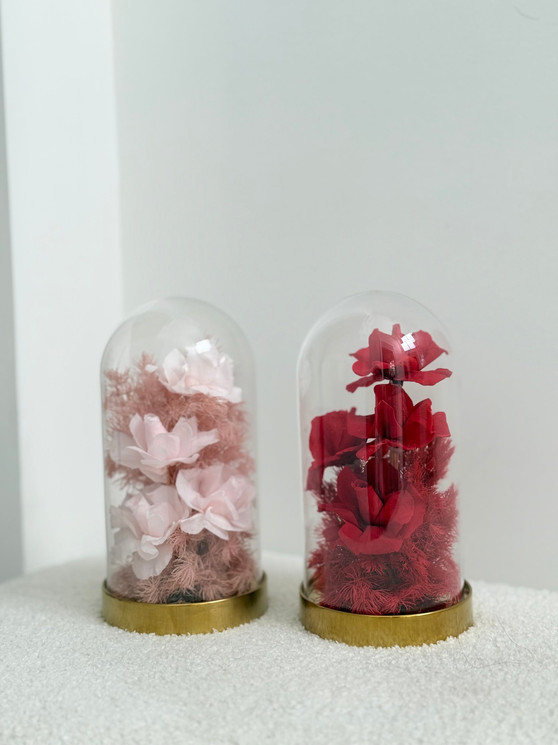 Dome 19cm in height with 4-5 real preserved roses in each and packaged in a jute bag.